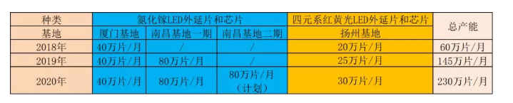 首先分享一下乾照的產(chǎn)能情況。乾照光電南昌基地分兩期共投資50億元。其中一期工程于2018年1月正式動工,2018年12月建成并投產(chǎn),將新增氮化鎵LED外延片和芯片產(chǎn)能80萬片/月(折合2英寸)。二期工程將根據(jù)市場情況擇機(jī)動工,將在一期工程的基礎(chǔ)上再增加80萬片/月的產(chǎn)能。