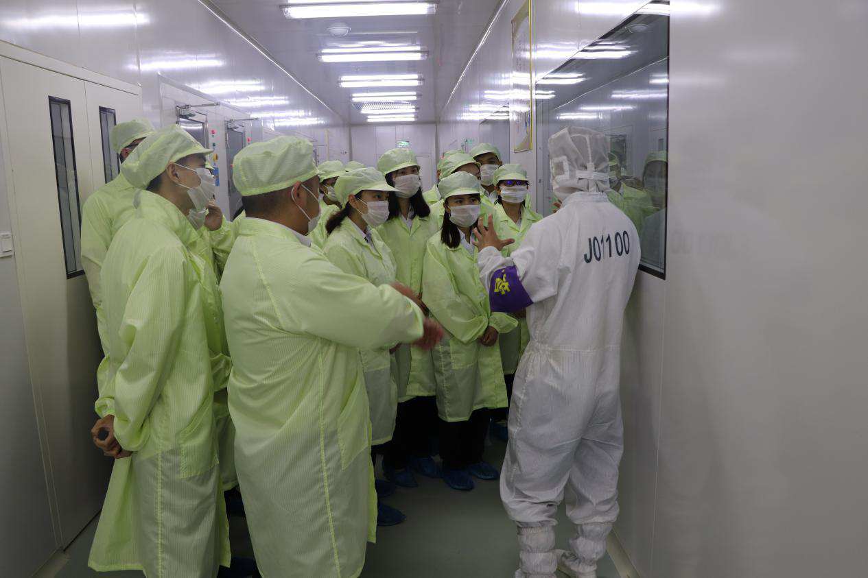 在展廳,學研班學員們了解了公司的企業文化、主要產品以及江西乾照光電的未來規劃。在生產車間,學員們觀摩了外延片的生長、檢測工藝流程,了解了芯片生產的全過程以及相關設備的功能介紹,特別是在芯片目檢站,學員們通過顯微鏡近距離觀察放大的芯片時,紛紛發出了驚嘆聲。