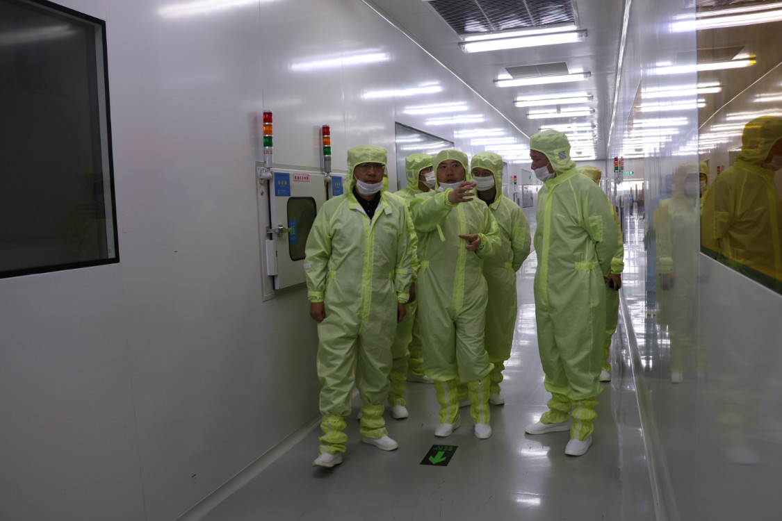 李廳長一行前往芯片蒸鍍、清洗、黃光站、點測站等生產(chǎn)車間進行了參觀。劉兆引導(dǎo)大家觀看了車間內(nèi)生產(chǎn)設(shè)備的操作情況,對芯片的生產(chǎn)制作流程進行了講解。李廳長認真觀摩了產(chǎn)線的各個環(huán)節(jié),對企業(yè)現(xiàn)代化的生產(chǎn)技術(shù)和設(shè)備的運作程序表示高度贊賞。同時還認真聽取了劉兆對公司目前發(fā)展情況的詳細匯報,對江西乾照光電目前的發(fā)展態(tài)勢給予了肯定。
