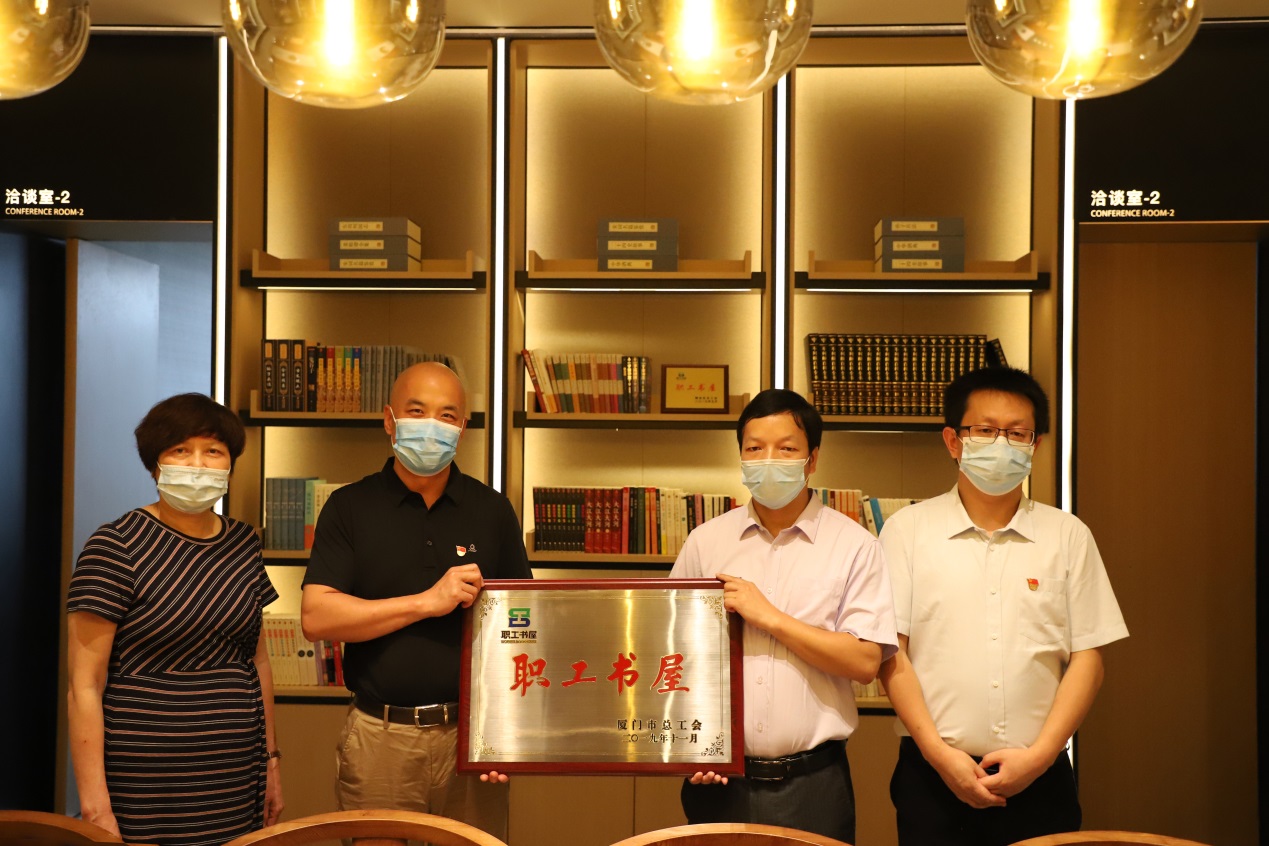 2020年5月26日,黨建掛鉤聯系單位廈門市總工會副主席劉義平一行蒞臨乾照光電調研指導,翔安區總工會常務副主席王黎明等領導陪同調研。調研組一行參觀了公司展廳、書吧以及黨建文化墻、黨群活動中心,詳細了解了公司生產、經營以及黨建帶工建工作情況。期間,雙方還舉行了“職工書屋”授牌儀式。