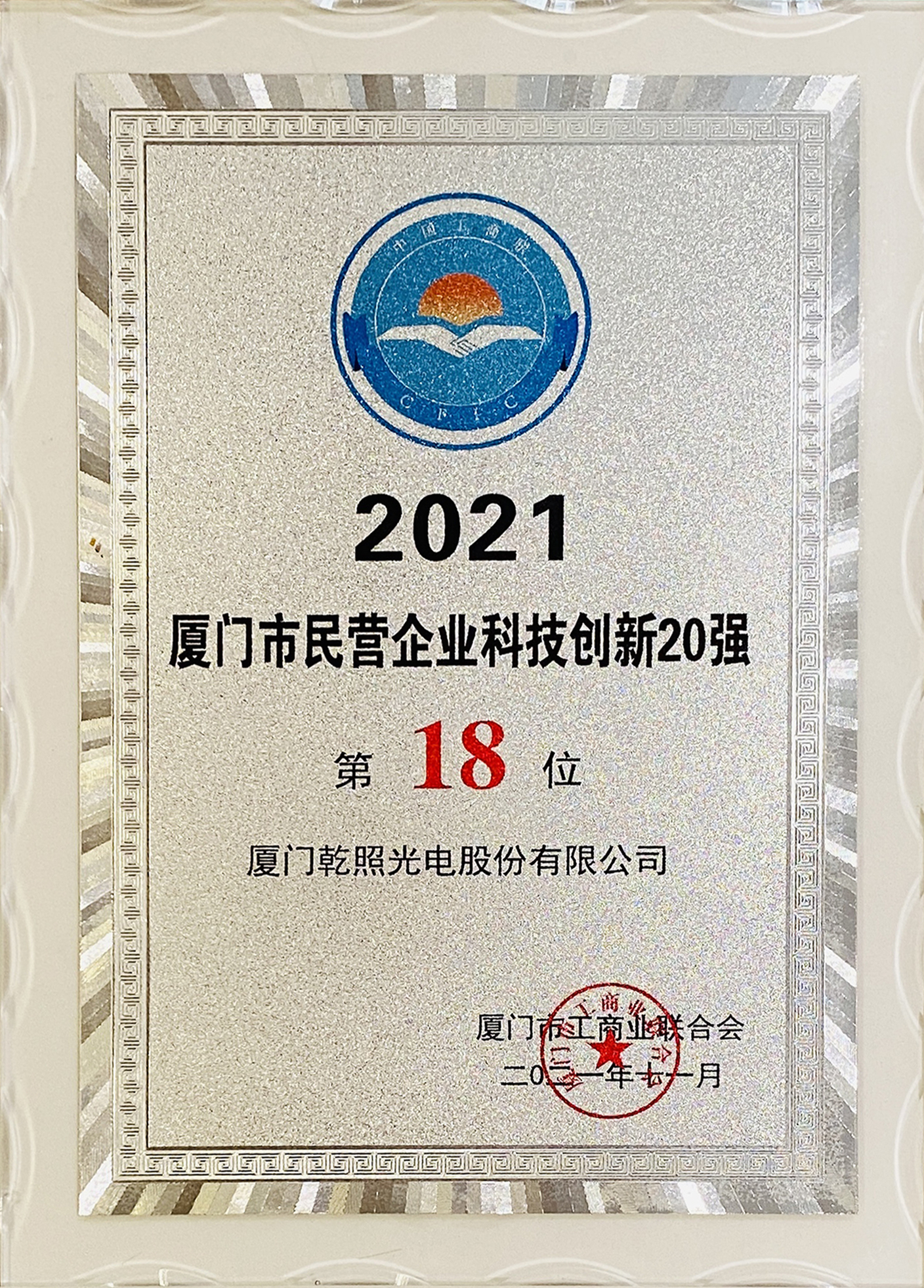 11月1日,廈門市工商聯(總商會)召開廈門市民營企業百強發布會。本次廈門市民營企業百強評選共有239家企業參評,涵蓋面廣代表性強。廈門乾照光電股份有限公司榮獲“2021廈門市民營企業100強”,成功入榜“2021廈門市民營企業科技創新20強”。