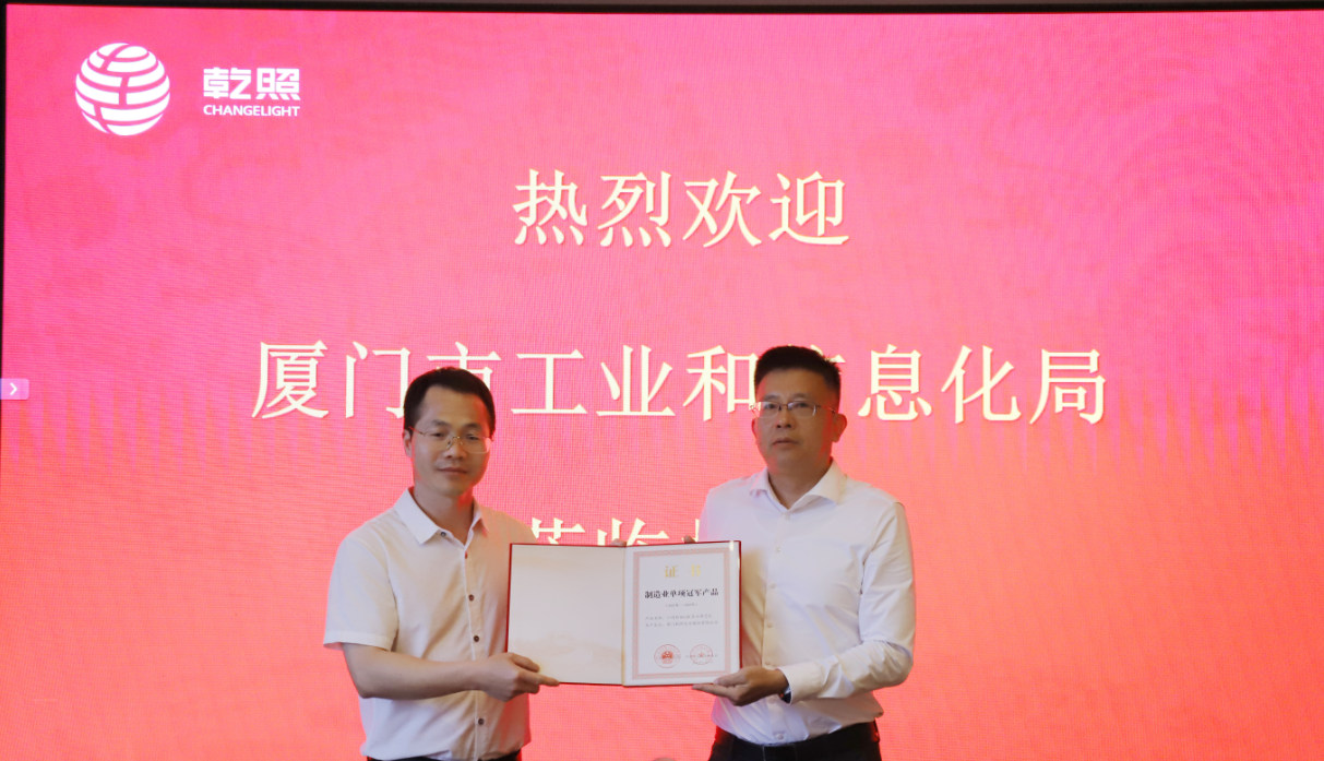 陳秉佳處長、邱忠強二級調研員一行在公司展廳聽取了關于公司生產經營、產品應用等情況的介紹。隨后在會議室,雙方進行了授牌儀式。陳秉佳處長指出,此次廈門共有4家企業的產品成為新一批單項冠軍產品,截至目前,廈門已有14個企業(產品)被認定為國家級制造業單項冠軍。因此,乾照光電能夠獲此殊榮,實屬不易也證明了企業的實力。希望企業再接再厲,制造出更多的“冠軍產品”。