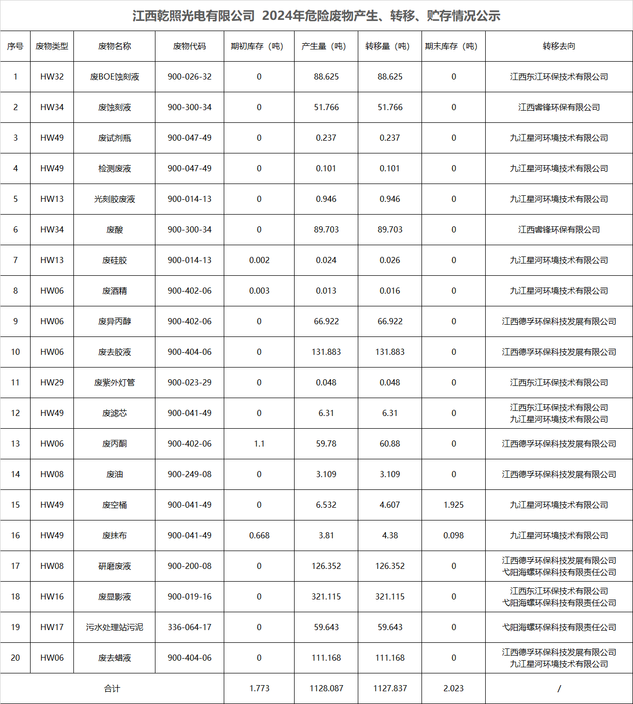 江西乾照光電有限公司 2024年危險廢物產生、轉移、貯存情況公示