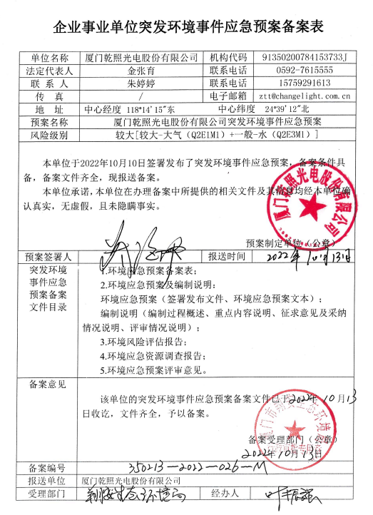 廈門(mén)乾照光電股份有限公司突發(fā)環(huán)境事件應(yīng)急預(yù)案公示
