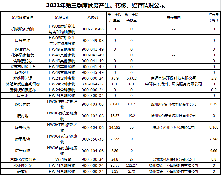 揚州乾照光電有限公司2021年第三季度危廢產生、轉移、貯存情況公示