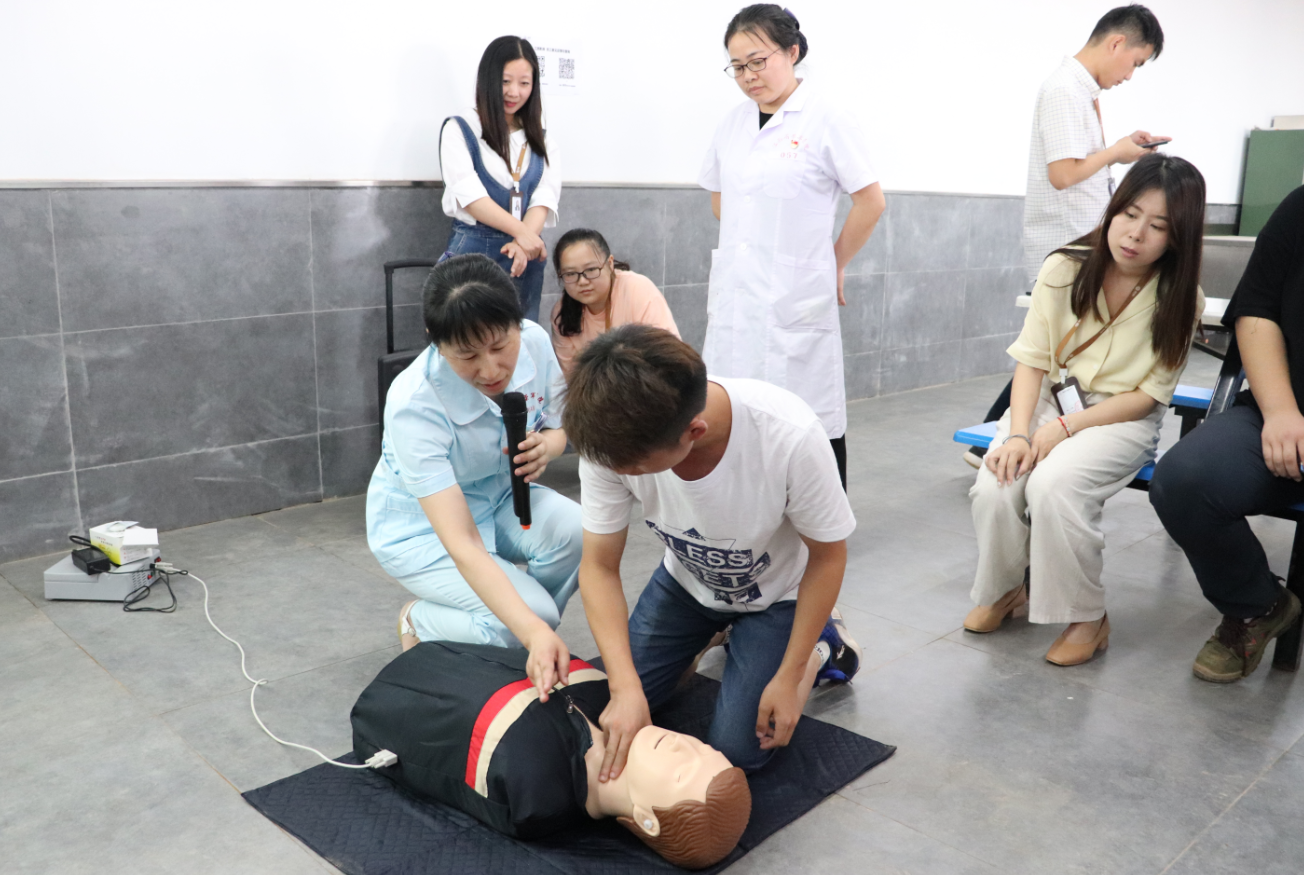 講座以理論和實踐相結合的方式展開,首先由江西省榮譽軍人康復醫(yī)院黎勇強、鐘笑兩位醫(yī)生分別對化學品灼傷,吸入有毒氣體的現(xiàn)場緊急處理、心肺復蘇的流程、外出血的現(xiàn)場處理、噎食的急救進行了知識宣講。接著,高彩虹、付萍兩位醫(yī)生進行了調整體位、打開氣道、判斷呼吸、人工呼吸、胸外心臟按壓等急救法的現(xiàn)場操作演示,并請員工們參與體驗,現(xiàn)場進行急救操作,讓大家在輕松的教學氛圍中掌握心肺復蘇法的操作技能。